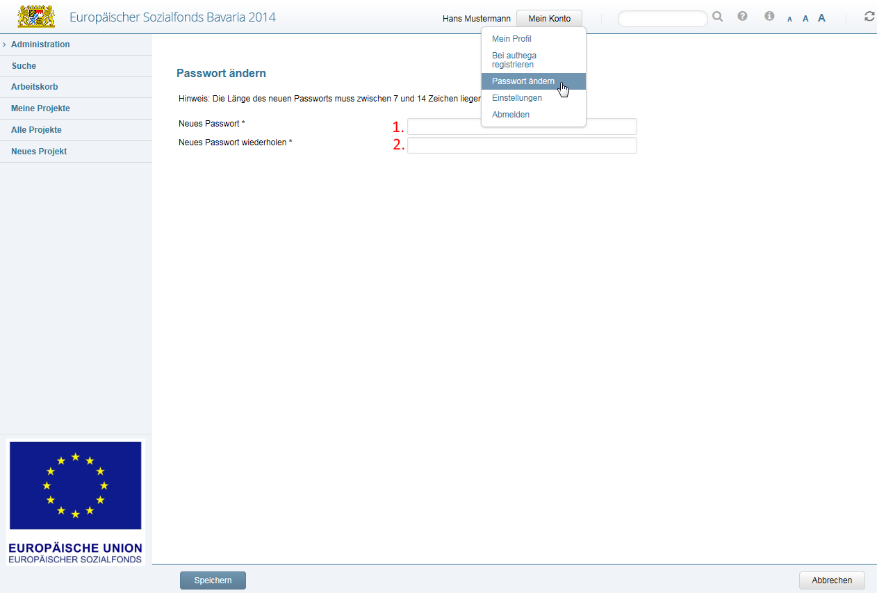 Der Menüpunkt "Passwort ändern" ist nur sichtbar, wenn Sie kein aktiviertes authega-Konto haben und sich mit Benutzernamen und Passwort bei ESF Bavaria 2014 angemeldet haben.