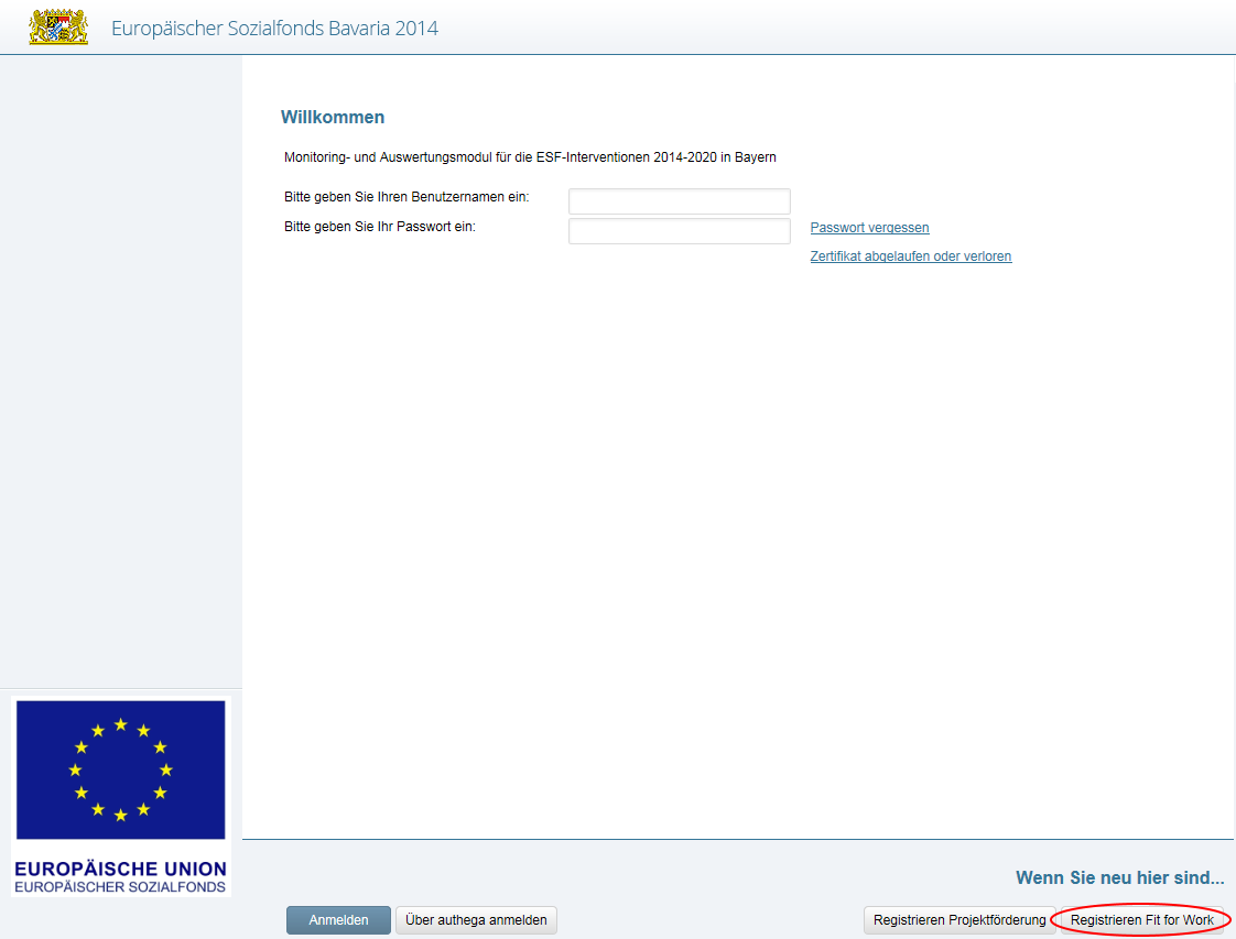 Klicken Sie im Anmeldedialog auf die Schaltfläche "Registrieren Fit for Work"
