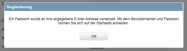 Wenn das neue Benutzerkonto erfolgreich angelegt und die E-Mail zum Abschließen der Registrierung versendet werden konnte, öffnet sich der folgende Dialog, den Sie bitte duch einen Klick auf "OK" bestätigen: