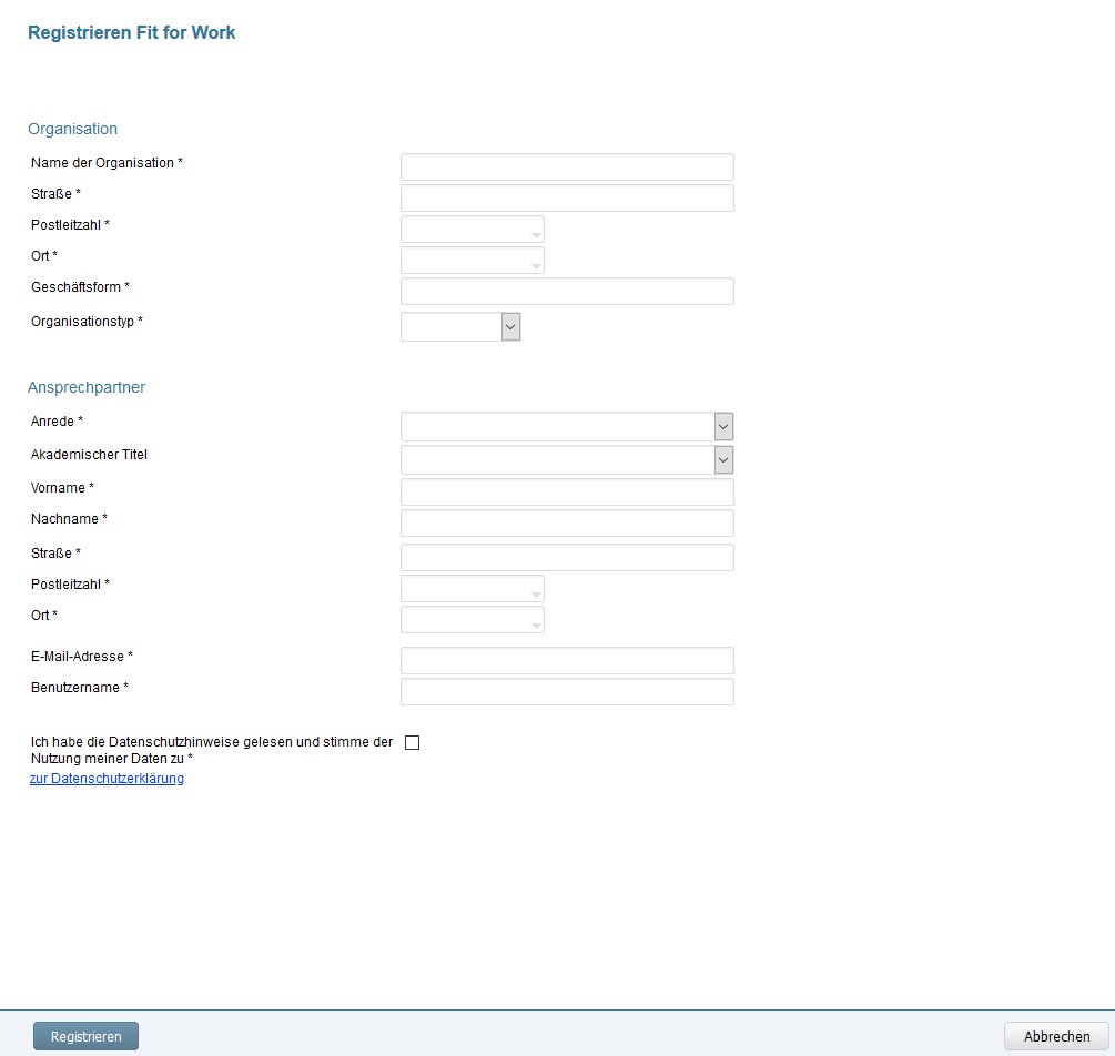 Es öffnet sich der Dialog zur Eingabe der Daten zum Betrieb/der Organisation sowie zum Ansprechpartner: