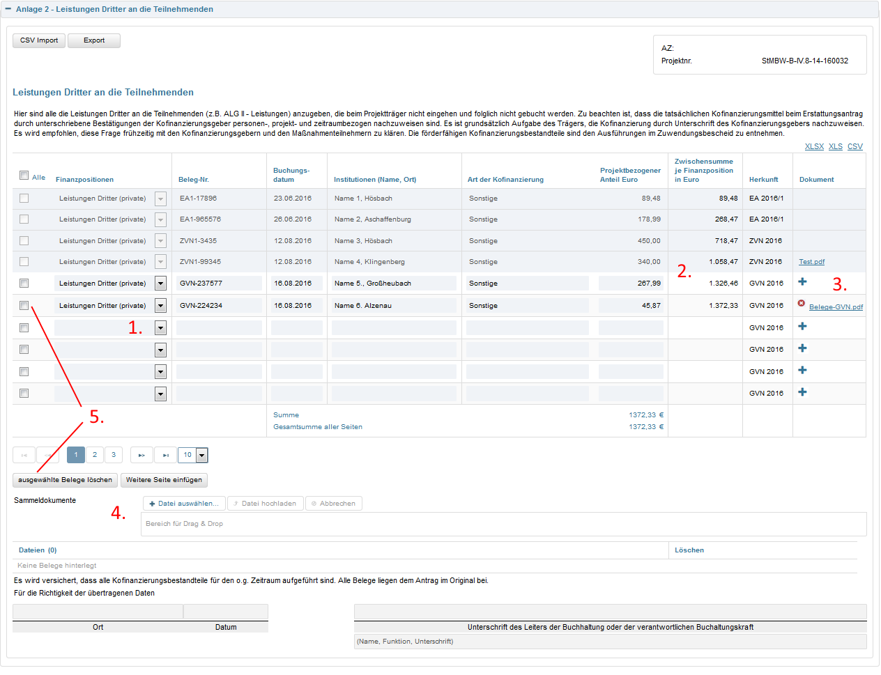 Der zweite aufklappbare Bereich „Anlage 2“ enthält ein Berechnungsblatt zur Erfassung von Belegen zu Leistungen Dritter an die Teilnehmenden (z.B. ALG II-Leistungen), die beim Projektträger nicht eingehen und folglich nicht gebucht werden.